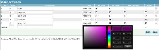 Issue statuses – customizable. New issues statuses can be created. There is a page for managing issue statuses (which before version 4.5 were fixed):