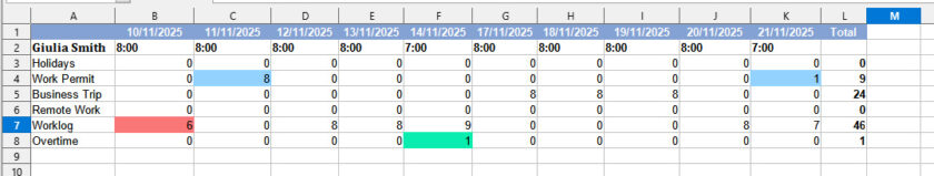 Let’s take a simple example: this is what Giulia’s timesheet, an employee of Acme Ltd, looks like for the month of November.