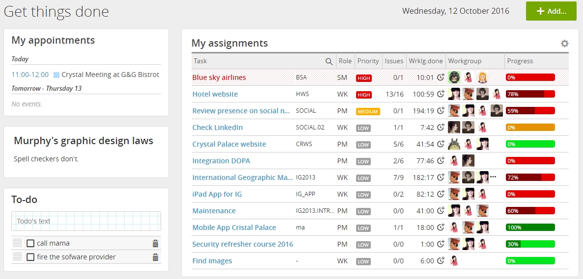 Twproject dashboard has been redesigned to improve readability, helping your team getting things done. Task requiring attention are now more visible, appointments are easy to read and find. Twproject customizable dashboards are your home to check open tasks and things to-do and we are always at work to get it better and better.