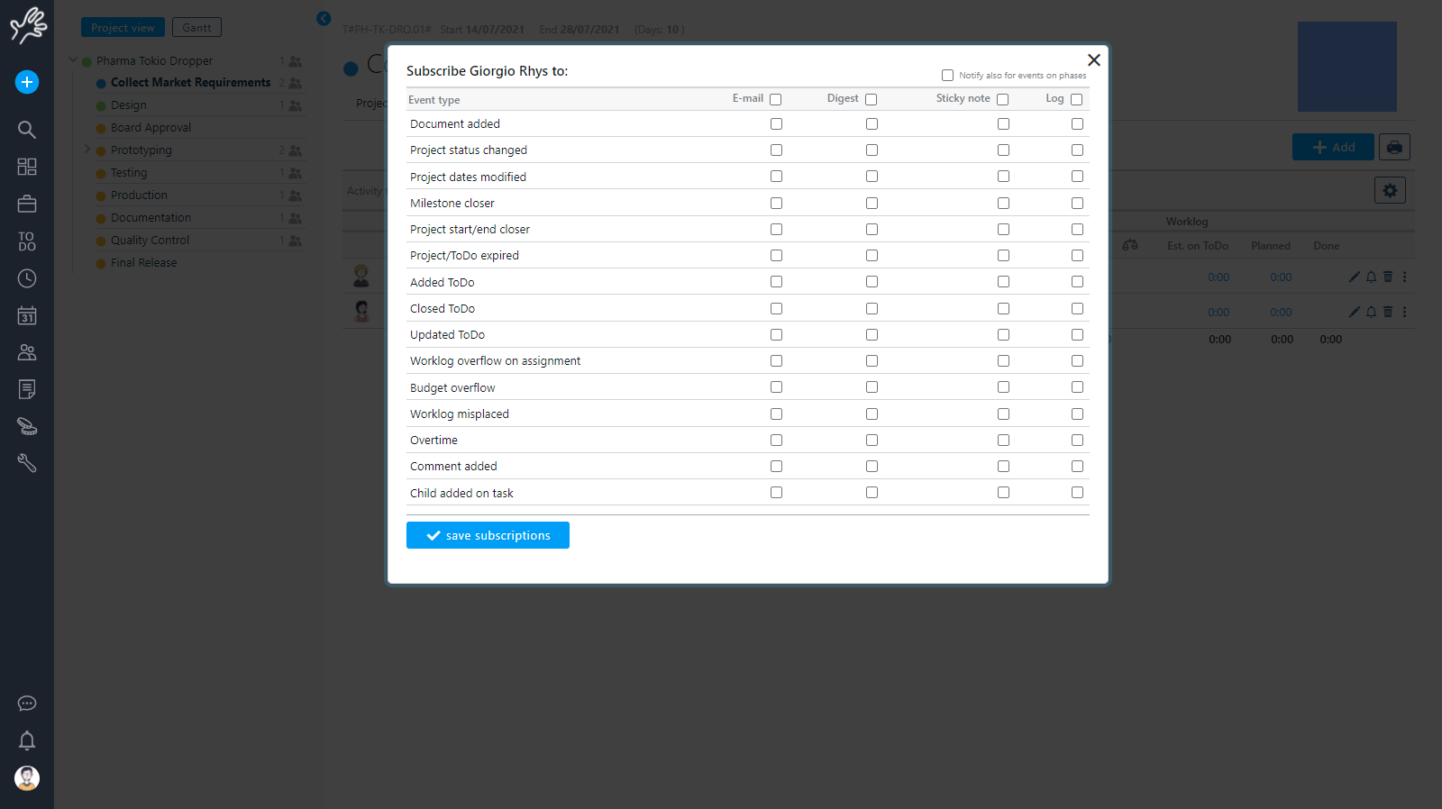 When you create the assignment, you are also subscribe the resource to receive notification on some events happening on the project (“push” subscriptions). By default “events” you will be subscribed to, depend on the role you are playing; “project managers” will receive, for instance, notifications on cost, “workers” will not. Every user can add/remove subscriptions, and default subscriptions can be changed as well.