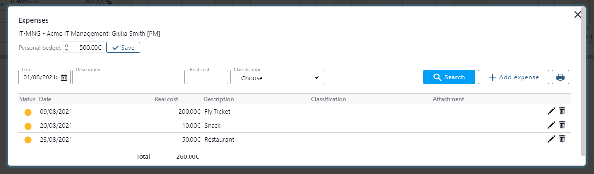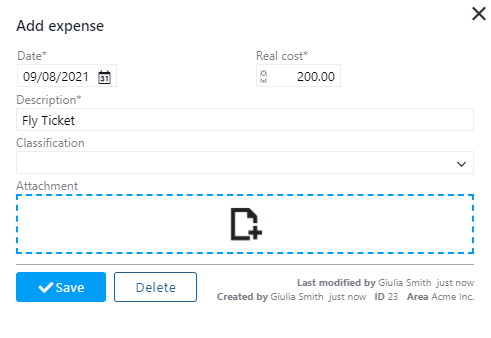 In the expense editor you can add its date, a description, the real cost, a classification and you can even attach a file, for example the receipt of your expense.
