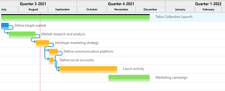 The PM can define a total project duration and assign a specific duration to the phases, thanks to the elastic dependencies, he can, while maintaining the logic of the dependencies, create a lag between the phases and therefore leave to PMA, PMG and PMD great freedom of action (moving end and start data) without affecting the overall dates!