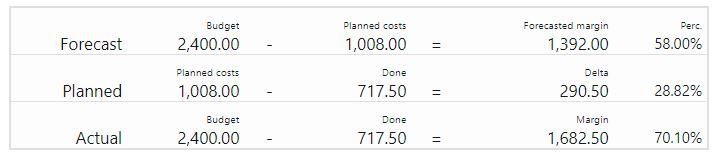 On this example your forecast margin (calculated with budget and planned costs) is 850. This is the first estimation you did, and probably it is really close to what you said to your “customer”.