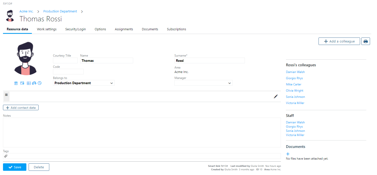 This means that “Giulia Smith” is part of the “IT department”. The department belongs to Acme Inc. company.  This is how Twproject constitutes an organigram, as a tree.