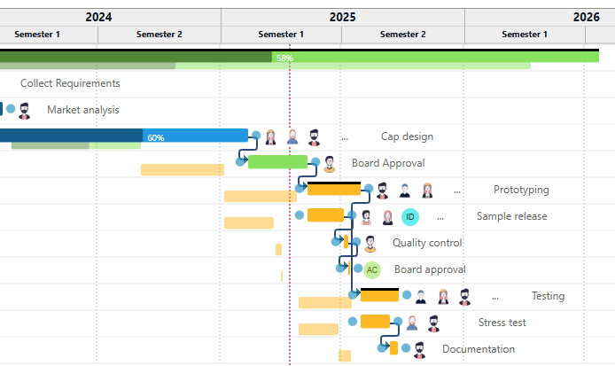 Twproject powerful and friendly Gantt chart is the starting point for planning your activities. Break down the project into phases and sub-phases according to your needs. Define durations and dependencies.