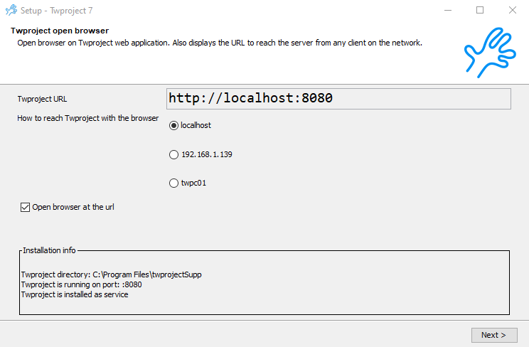 Take notes of the address; you will need to remember it the next time you will access Twproject.