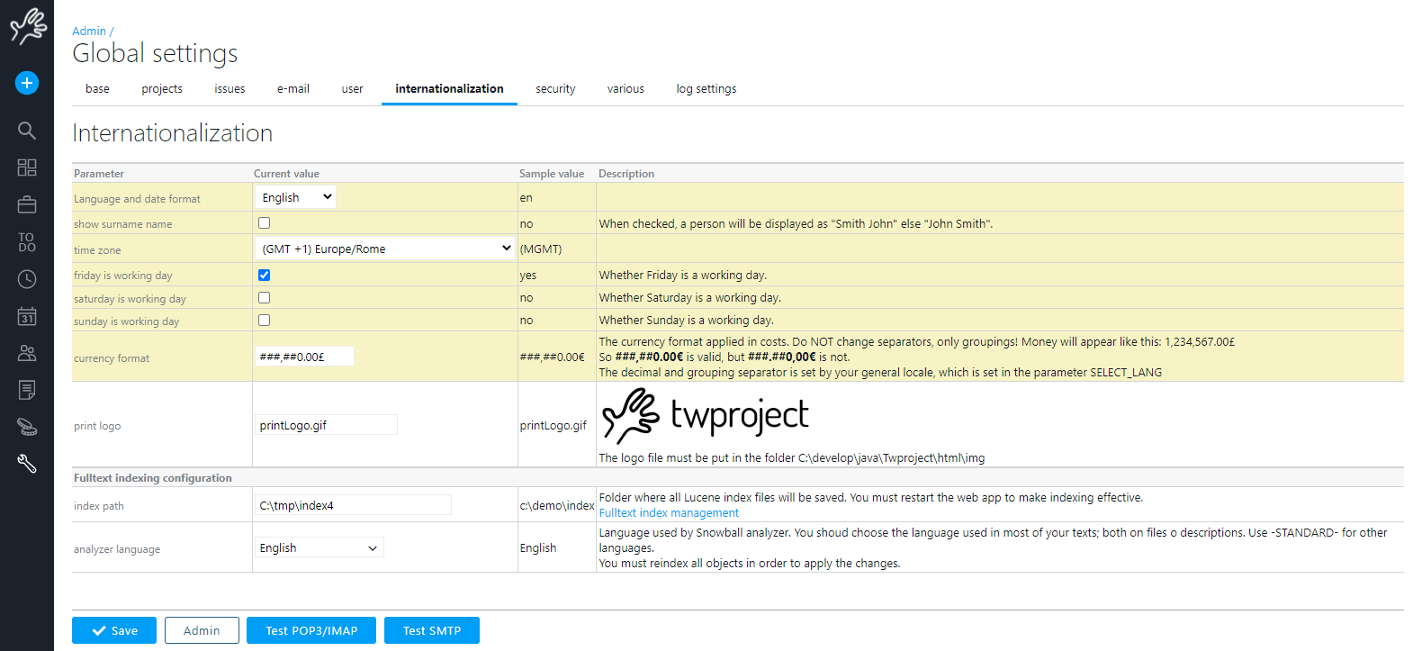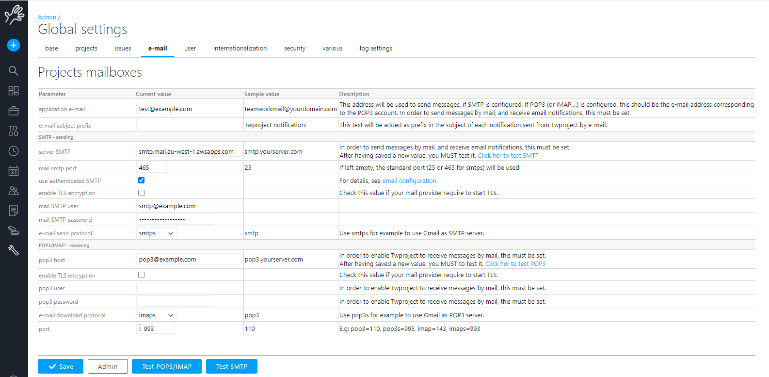 This is quite simple, as it amounts to configuring “send e-mail” from the server where Twproject is installed. This consists in setting an SMTP server, and an e-mail from which e-mails will be sent. These two parameters are all is generally needed to set up send e-mail from Twproject.