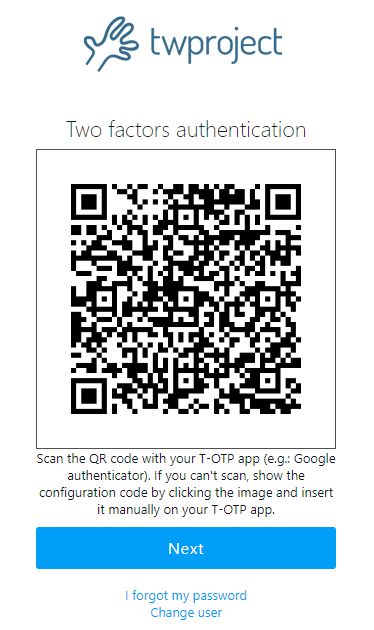 If you cannot scan the QR Code using the camera, for example because you are using Twproject mobile for the first login, you can insert it manually on your T-OTP app. Just click on QR and the code will be show: