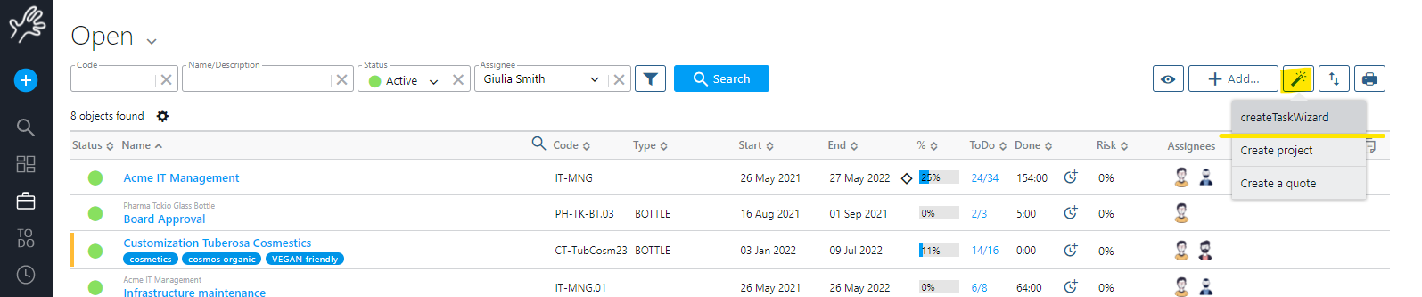 Twproject also provides the possibility of adding “custom wizards”, which will be accessed by having an additional button on the menus and creating say a project from a set of templates. An example wizard is provided in the folder