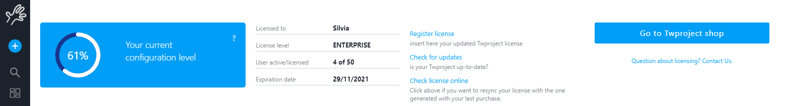 Going to “Twproject shop”, that is always open :-), you can buy or extend a license.