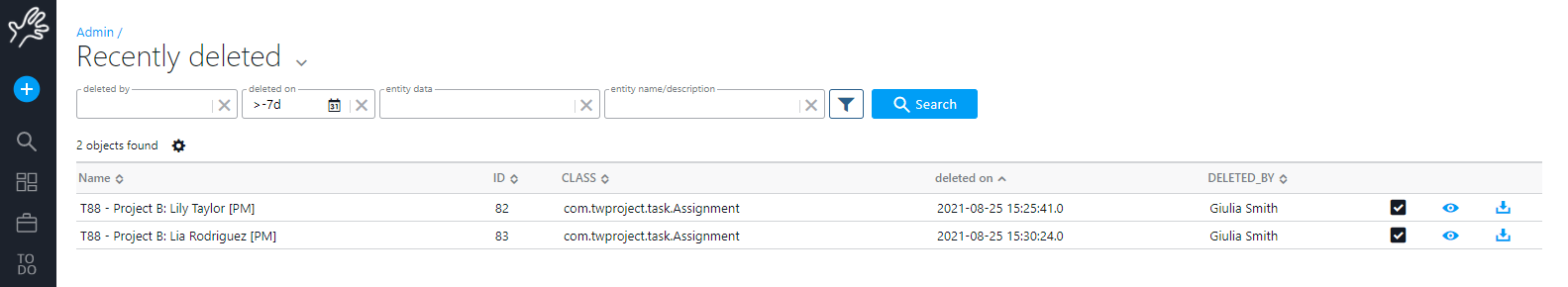 Every time a user delets a main Twproject object, such project or assignments nor ToDo, Twproject creates a delete log with a json object with all data deleted.