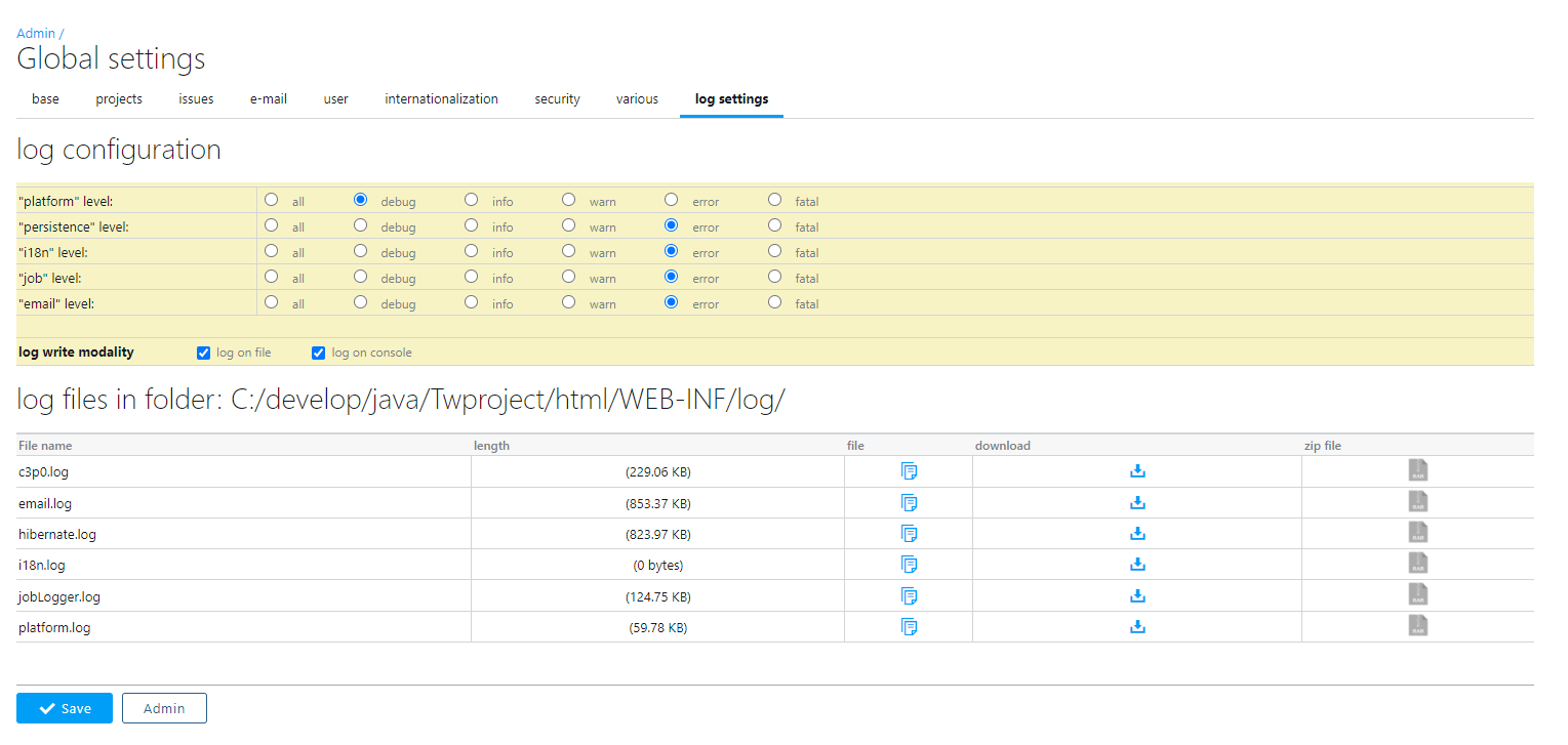 Twproject logs events using log4j. Logs are really useful when there is some trouble… (admin -> log levels).