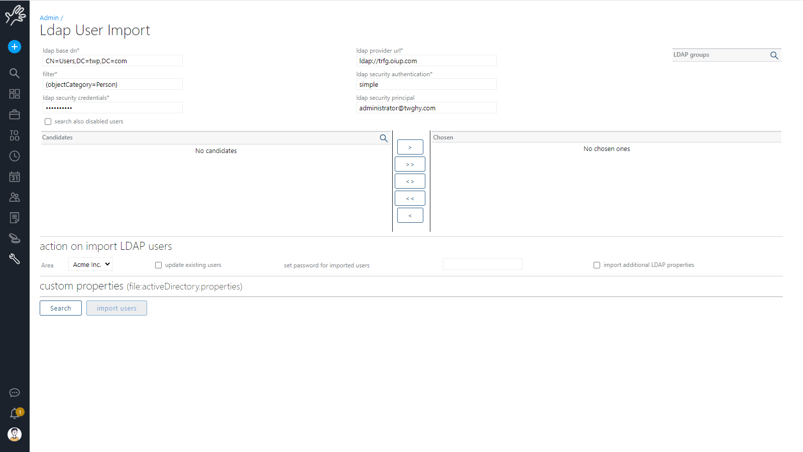 Here you can select the CN groups in which to search users, and once found some, pick those you want to import.