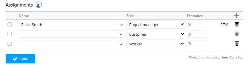 In questo esempio, l’assegnazione dice che “Giulia Smith” (l’utente loggato) è il “Project manager”, e che non c’è una stima del lavoro che deve svolgere; puoi completare le informazioni sul progetto in un secondo momento.