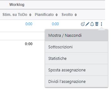 Statistiche: apre un pannello di statistiche relative all’assegnazione con ore stimate e lavorate.