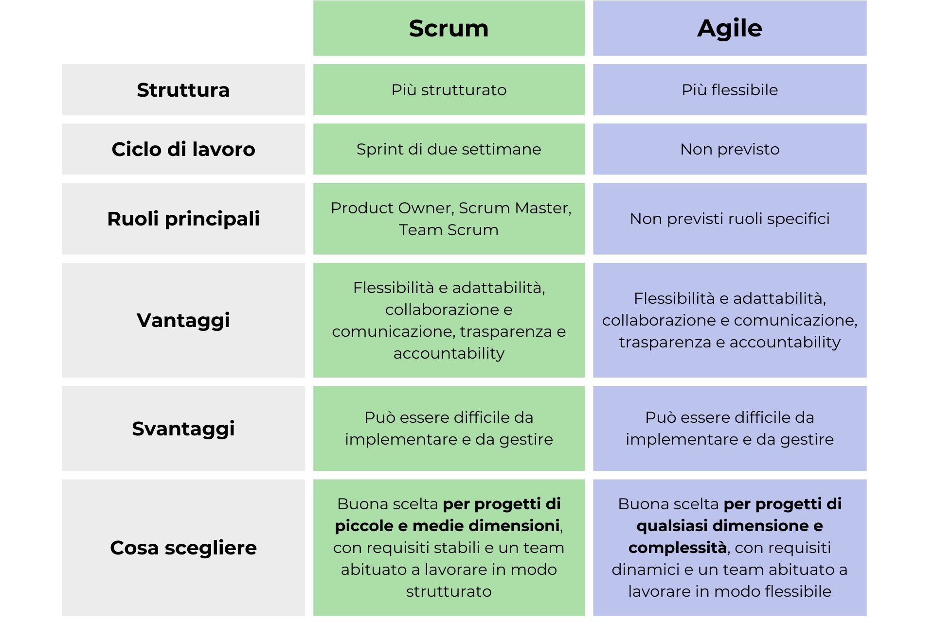 In generale, Scrum è una buona scelta per progetti che richiedono un’elevata collaborazione e comunicazione, mentre Agile è una buona scelta per progetti che richiedono flessibilità e reattività al cambiamento.