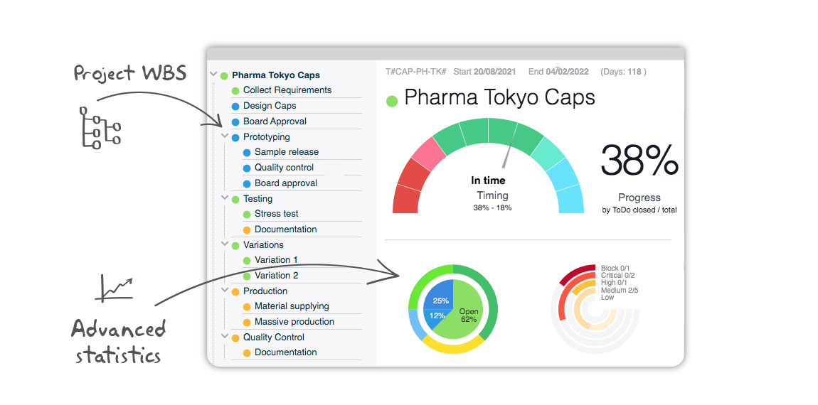 Setup your project structure with ease. The WBS follows you in every project section. Contextual alerts shows you overdue phases or ToDo, costs exceeding or overloaded resources.