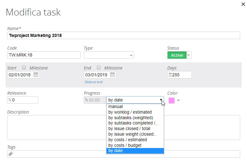 By worklog / estimated: task progress is calculated according to the work inserted on the estimated one.
