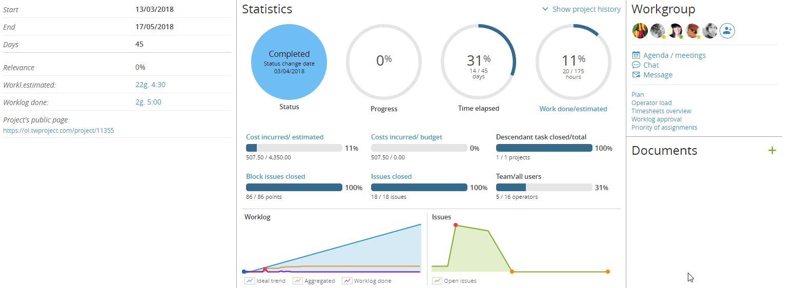 Twproject 6.3.63004 is out with a redesigned project statistics page. Thanks to your feedback, with our design team we decided to remove the project full editor moving it in pop-up, redesigning statistics and moving button on the right bar.
