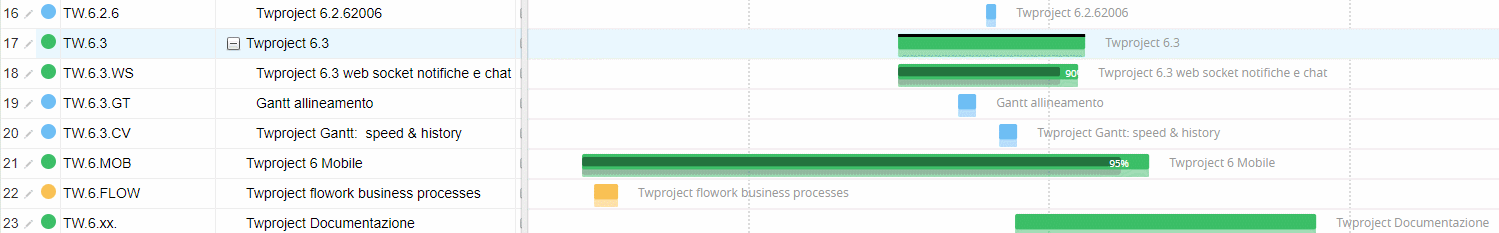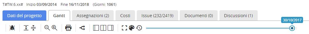 Another great feature of Twproject 6.3 is the Gantt history slider that will allow you to move back in time with your Gantt seeing how your projects has changed from their start. Clicking on the clock the slider will appear and you will be able to pick a date and see what was the status of your project at that date and its progress, a small lighter bar will appear below every task.