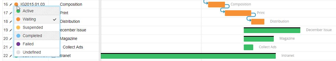 We also introduced a new task status for managing tasks depending from other. The new status is called “waiting” and it is managed only by the application through dependencies (not visible in dropdown). Thanks to this the “suspended status” became completely free for usage and acquire more powerful meaning. Suspended task does not alarm you anymore and are not counted anymore in resources workload.