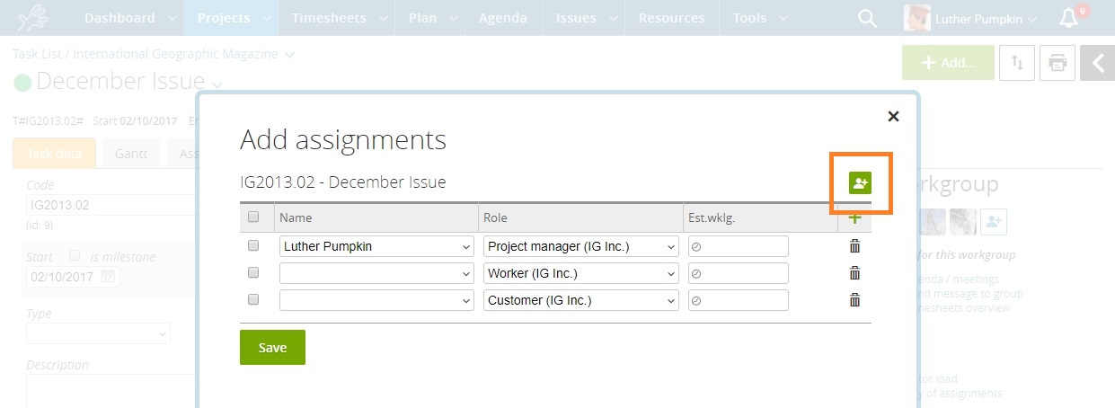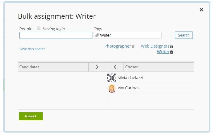 Thanks to this button you will be able to assign a filtered set of resource with one click. Resources can be filtered by name or tag or with already created filters, in my example I am creating assignments for the new December issue for National Geogrphic and I am searching for all writers that will work on this copy. I’ve a already created filter selecting all my writers.
