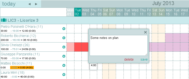 • ScreenShot024 Since the previous release you can add notes on single plan cell, this new feature will help you specifying to your resources all the needed details about their work already set in the plan. Notes can be added with a simple double click on the plan value, once added they will be shown with a small envelope. Communication within your resources become easier!