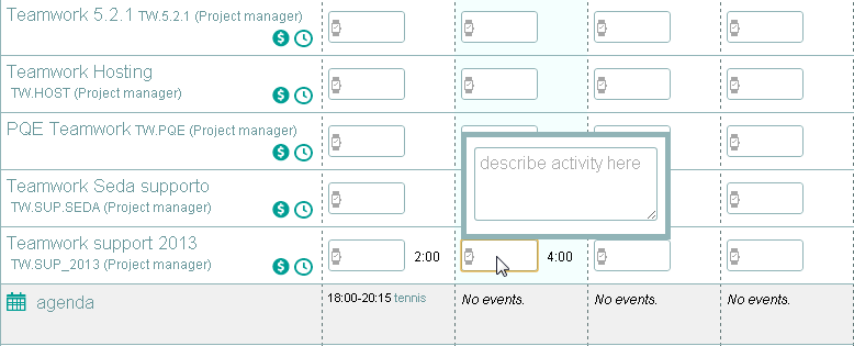 • ScreenShot026In the new release you will be able to add several entries for the same day/task in the timesheet page with a simple double click. Now it will be easier  to add different entries with different notes associated having a more detailed report for your projects!