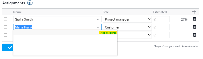 Choose the resource, the role played (project manager, customer, worker etc.) and if you already know, an estimated effort in hours.