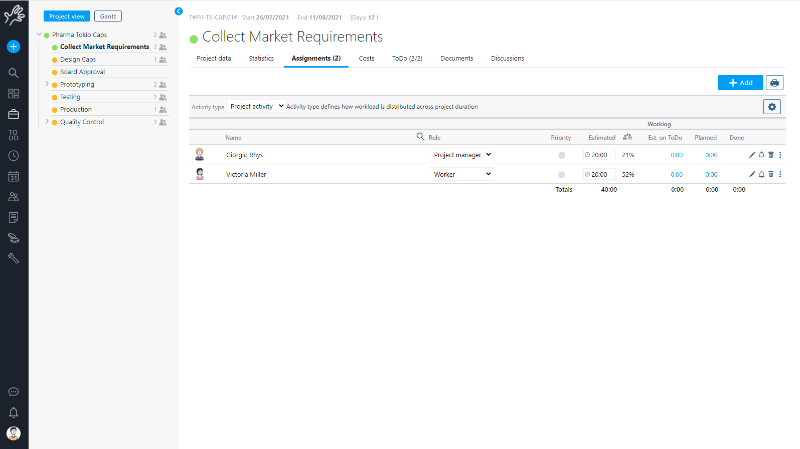 Assignments in Twproject are very important: when you assign a resource you will also implicitly define security settings of the project. In fact every assignment is “weighted” by a “local role” that gives permissions to the assignee. Permissions are, by default, propagated to descendants, so if you are PM on the root you have PM permissions everywhere, but if you are assigned on a child you can act on the child, not on the parent. This makes Twproject security very fine-grained, without the stress of managing permissions separately.