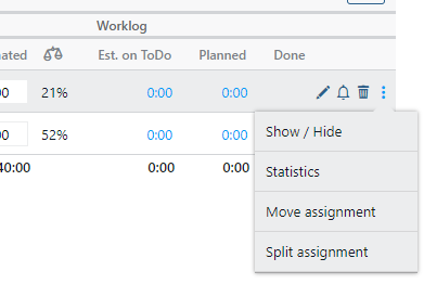 Statistics open a layer with all the statistics refereed to the assignments such as worklog done in time, expenses on budget and hourly cost variation in project period.