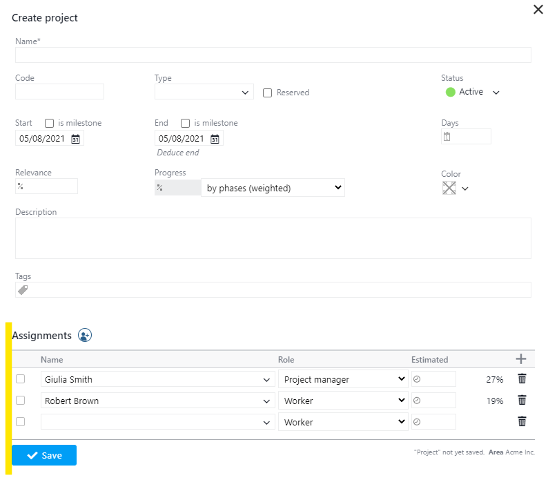While you are creating a new project, you can tell Twproject “who is working on this project” by creating one or more “assignments”