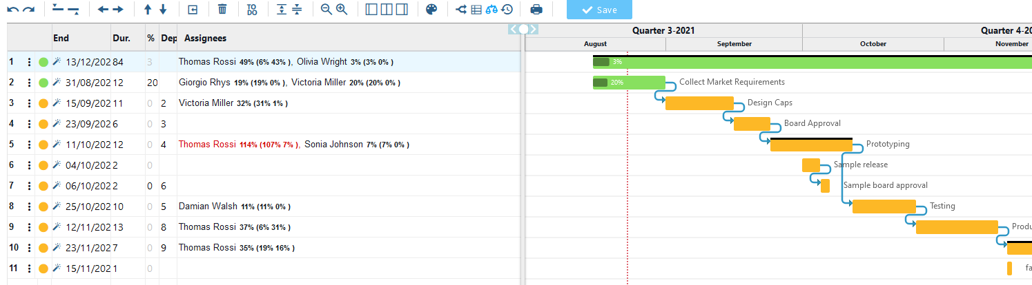 , you can activate a functionality to see all assignee on each phase with percentage capacity. Red users are overloaded.