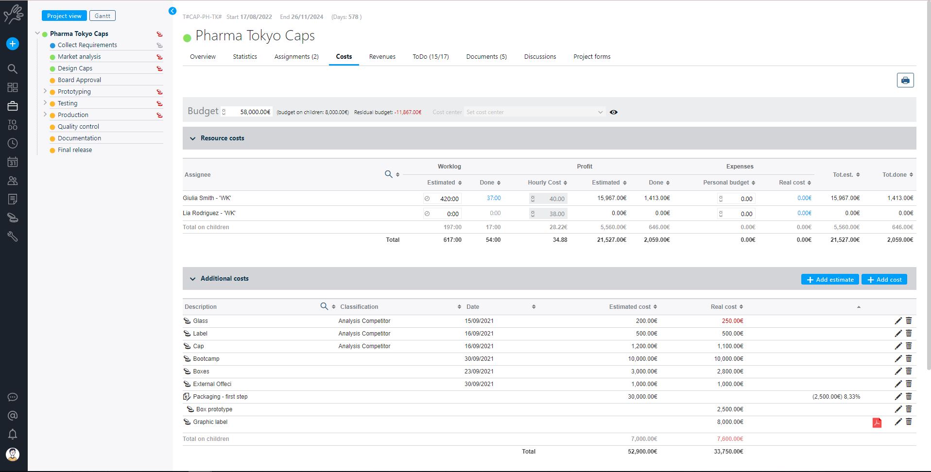 Costs are tracked for all projects and phases and you can navigate them easily with the WBS that will alert you with red icons in case of something exceeding.