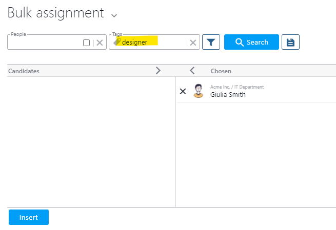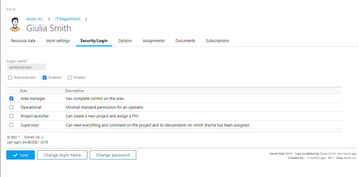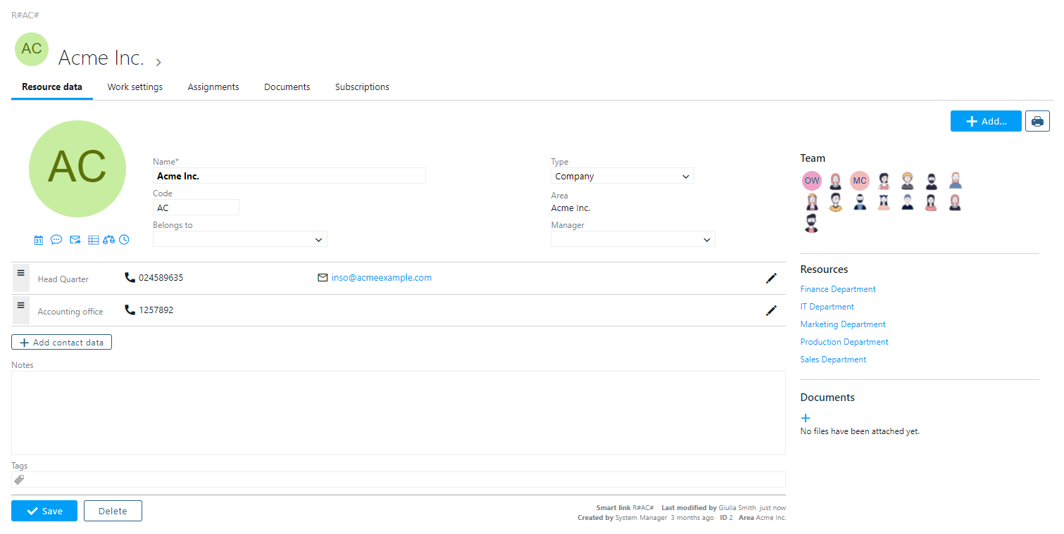 This means that “Giulia Smith” is part of the “IT department”. The department belongs to Acme Inc. company. This is how Twproject constitutes an organigram, as a tree.