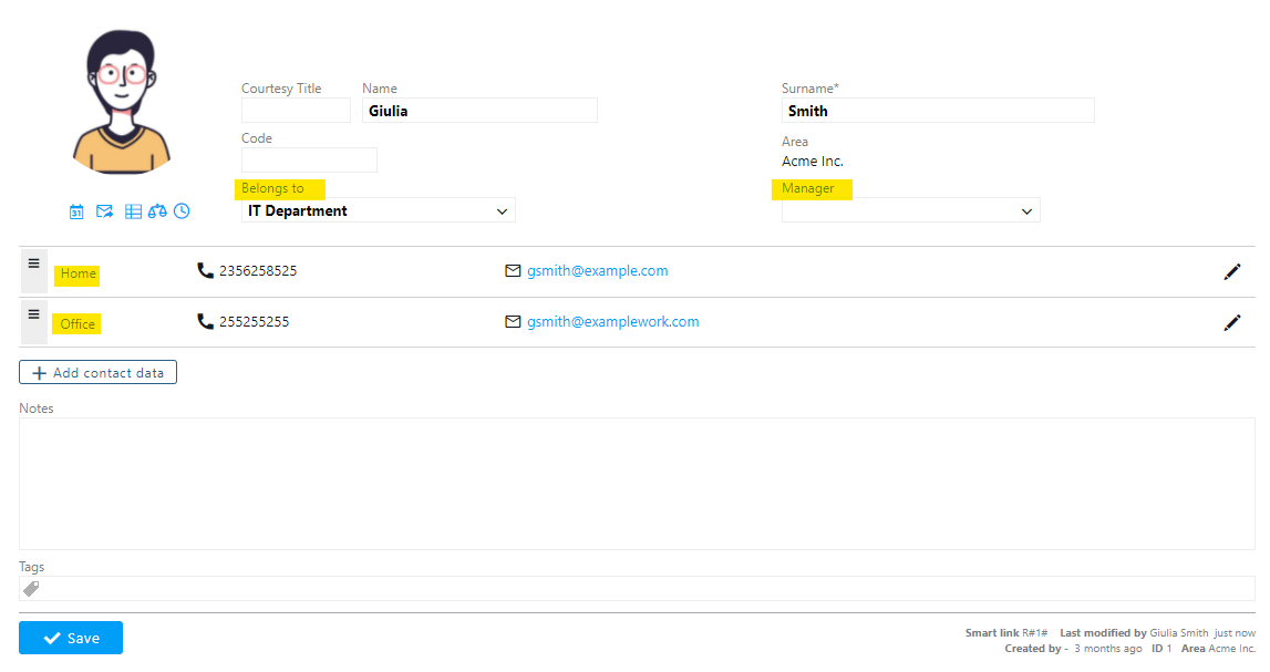 The form allows specifying all main data for a person as name (or first name), surname (or last name), e-mail addresses etc. that are common in a basic directory management. If you think this is enough just press save and your first resource will be created. Only the surname field is mandatory.
