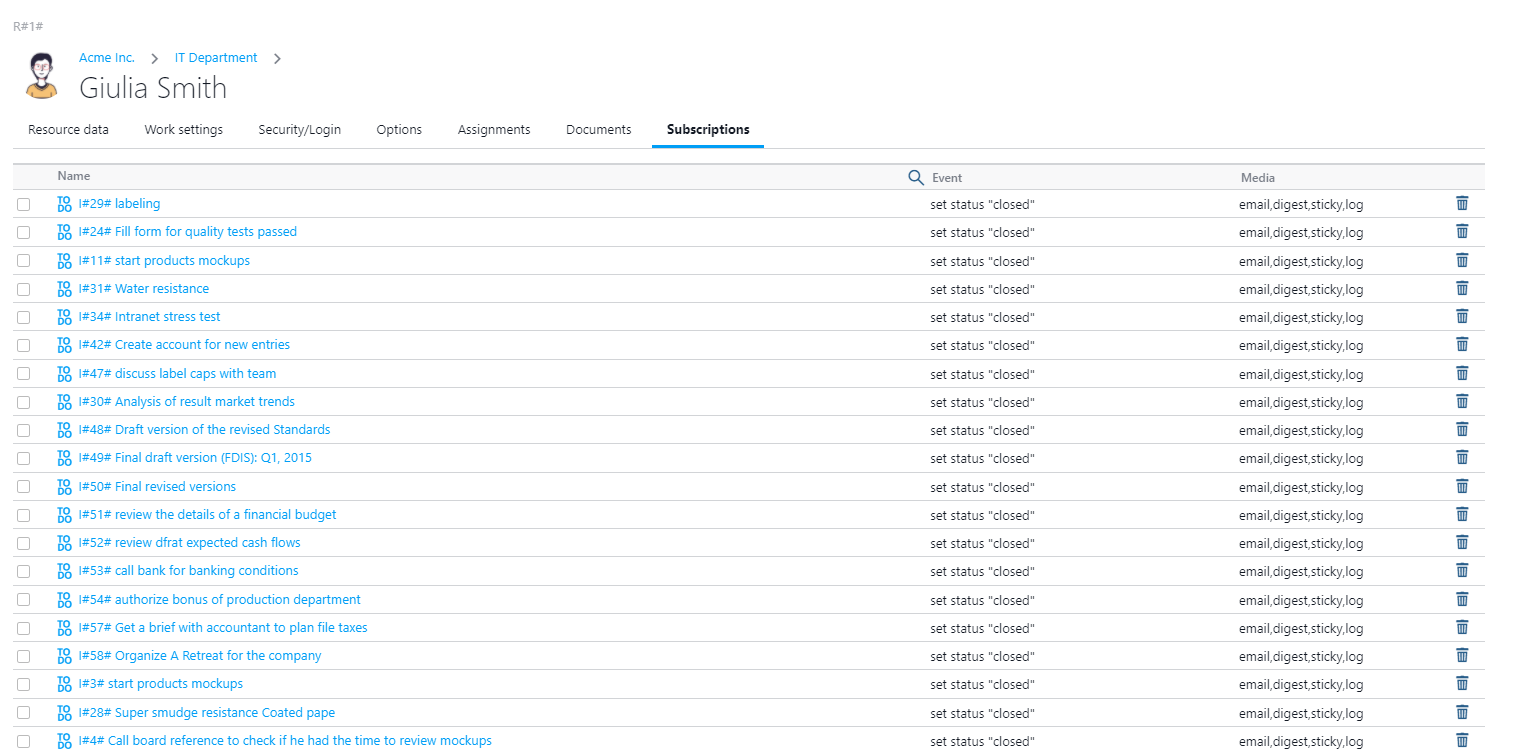 The “subscriptions” tab shows all the subscription created according to your assignments. Every time you assigned to a project/phase, according to the role, you will be subscribed to some events to be notified. Twproject has an event based subscription engine, so you can be subscribed to listen to a specific event. Subscriptions can be modified by the user and refined.