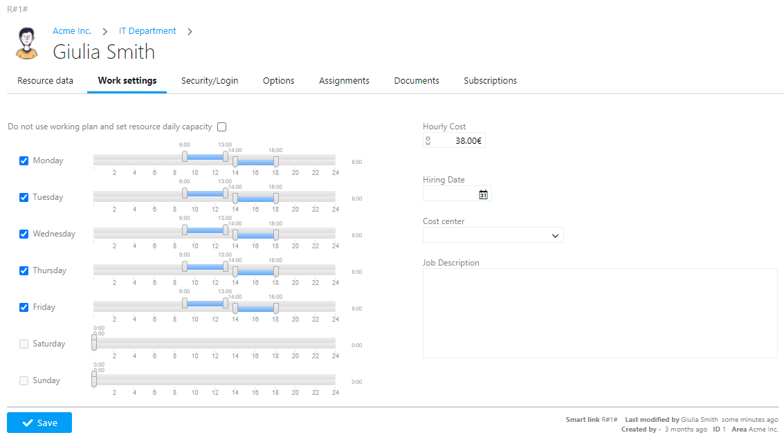Disabled users are not counted in the license total; so if you have 10 active users and 50 disabled ones (e.g.: temporary employees for specific projects than do not currently work with you), you only need a 10 user license. When you are creating a new resource (actually this works for every important entity) the button bar reports the current status of the object: When the object is already saved the status appears slightly different by reporting creation and last change dates: