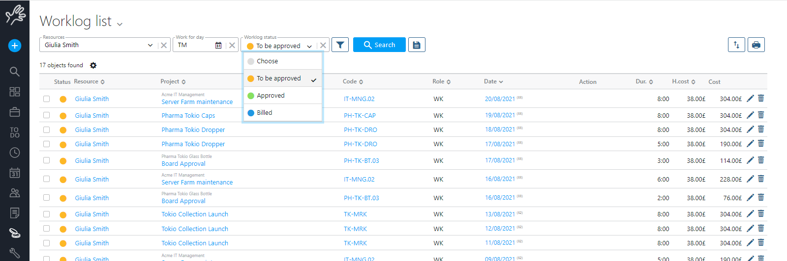 You will get the list of work log matching your filter. As usual you can store you preferred filters for future usage.