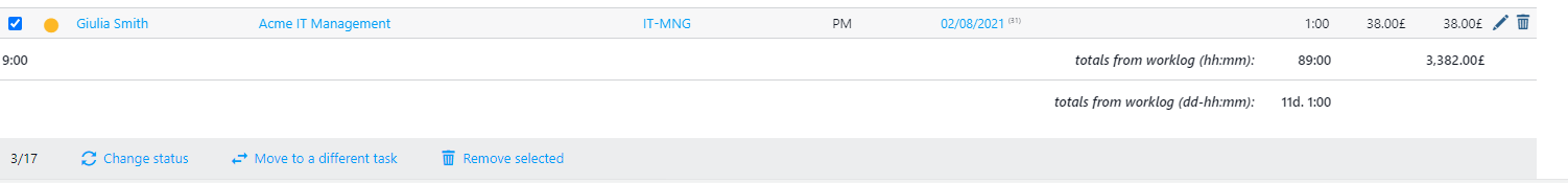 Filtering on this page can have two aims: getting worklog totals for a period, or moving worklog to another assignment/project, selecting it at the bottom of the page. As soon as you check a row:
