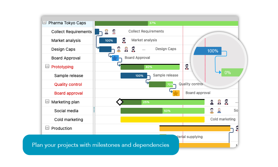 Set goals & milestones within a project to ensure everyone knows what is expected and by when. Twproject will alert you on approaching deadlines and will show you the project critical path having a clear visibility into how things are going at each stage.