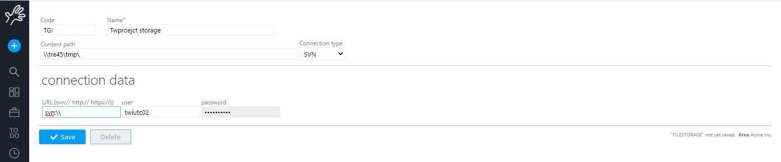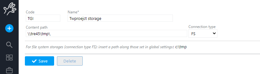 Usually files servers contain relevant data, so you should be careful in creating a file storage root. Twproject in order to improve security in case of file system connections requires that the administrator defines some file storage seeds in global setting, which restrict available paths. So a standard user cannot create a storage outside pre-authorized paths.