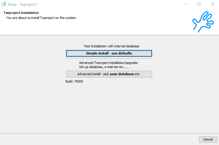 This is the easiest way to start with Twproject if you want to evaluate it. A default local database will be set up.
