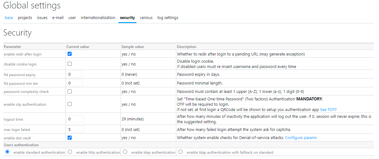 you can define Twproject’ password, lenght, complexity and security policies.