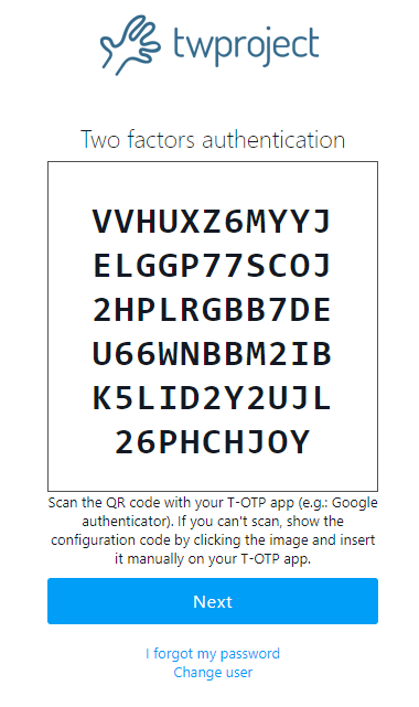 If you cannot scan the QR Code using the camera, for example because you are using Twproject mobile for the first login, you can insert it manually on your T-OTP app. Just click on QR and the code will be show: