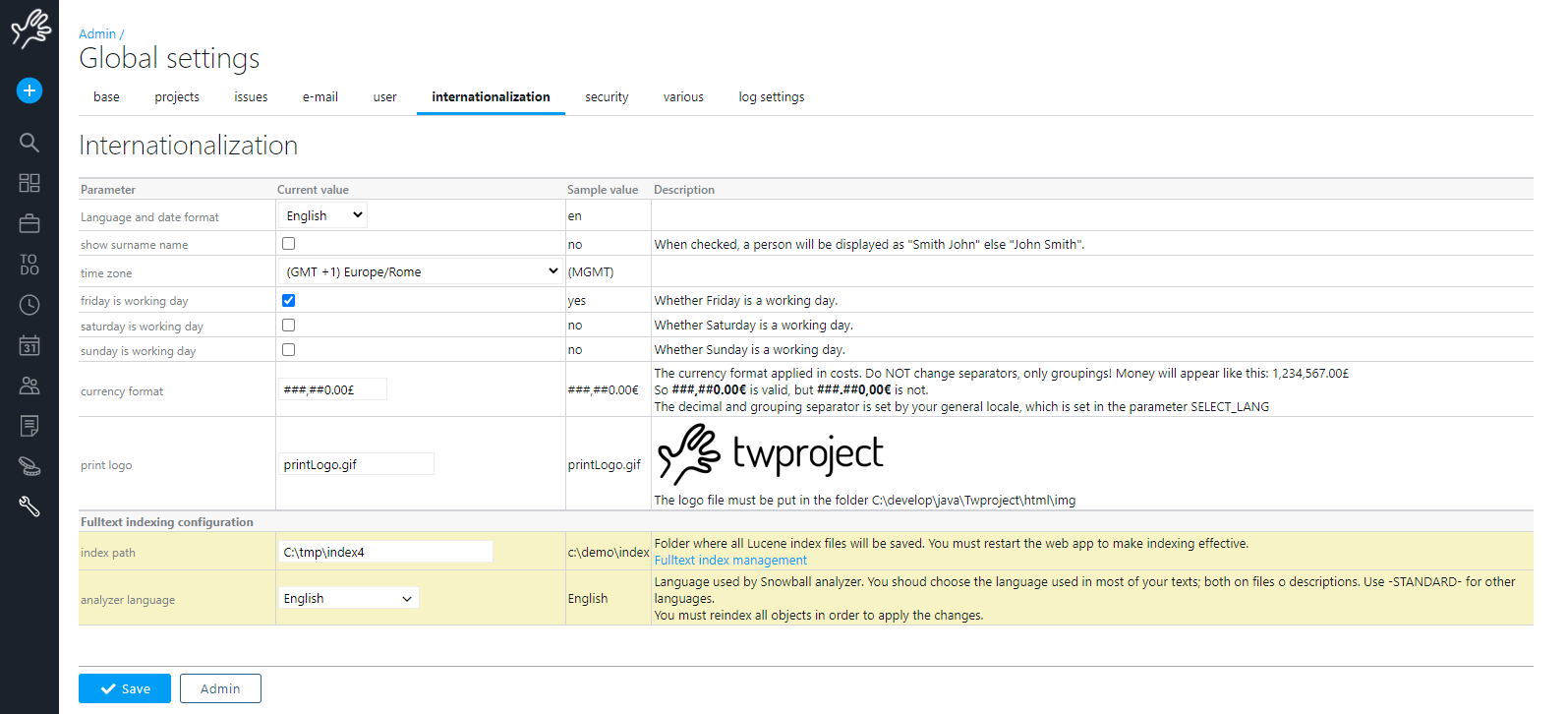 First of all the index files location, then the analyzer language. This analyzer is used to stem correctly your data. Stemming allows you to search “work” and find also “working”, of course it works correctly when the language you are writing data and the stemmer match.