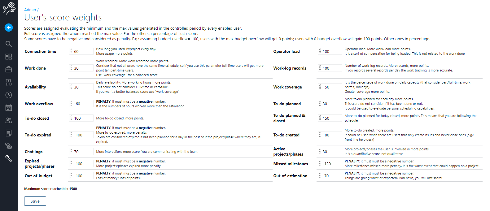 Some scores have to be negative and considered as penalty. E.g.: assuming budget overflow=-100, users with the max budget overflow will get 0 points; users with 0 budget overflow will gain 100 points. Other ones in percentage.