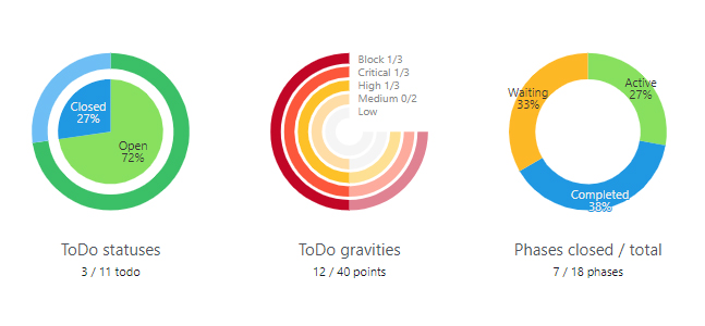 Reports become more powerfull when they are visual. Get complete statistics about what is going on, how many ToDo you have, in which gravity and status. How much you have worked and when.