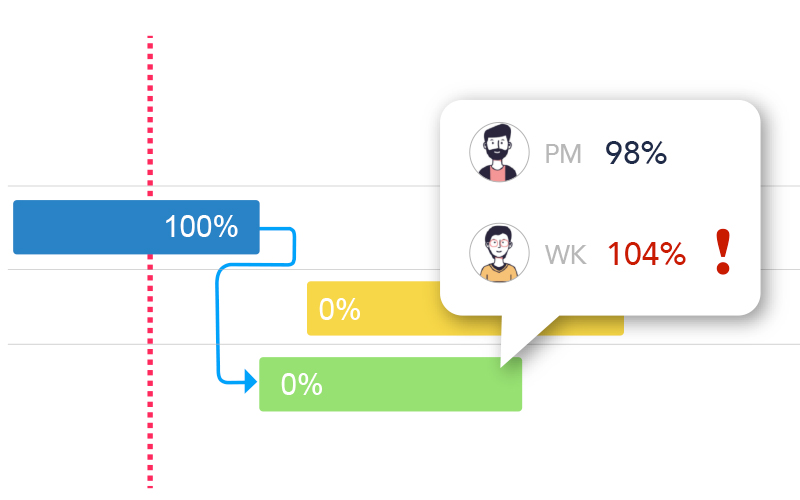 On a project Gantt you can now see load percentage of the resources assigned. Move activities and balance the loads. But that’s not all, Twproject can suggest a project end date (or a phase one) based on current loads.