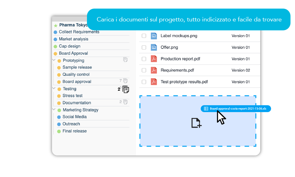 Twproject ti aiuta a mantenere i tuoi documenti organizzati: associali ai tuoi progetti e navigali facilmente. Finalmente potrai smettere di preoccuparti di file persi in qualche mail. Carica i file trascinandoli, crea dei file di testo direttamente sul progetto o crea un link ad un sito di tuo interesse.